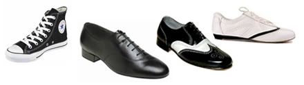 BALLROOM SHOES - A fairly common choice for guys and can be a inexpensive and comfortable option. Don't be fooled by the fancier pairs with the custom leather. After trying on the more expensive shoes, I brought a standard pair for $65 because it was lighter and more comfortable. These shoes are made with 1/2" heels as well as the standard 1" heels and have suede soles. You can pick up a pair at Capezios or almost any dance store.